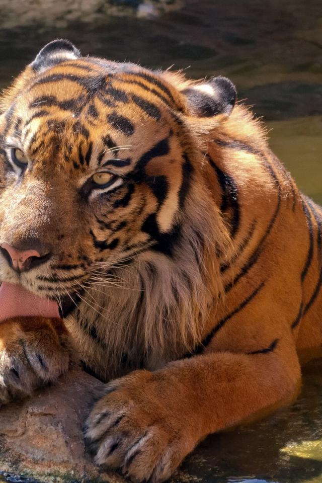 Wallpaper Large tiger licking his paw in the water