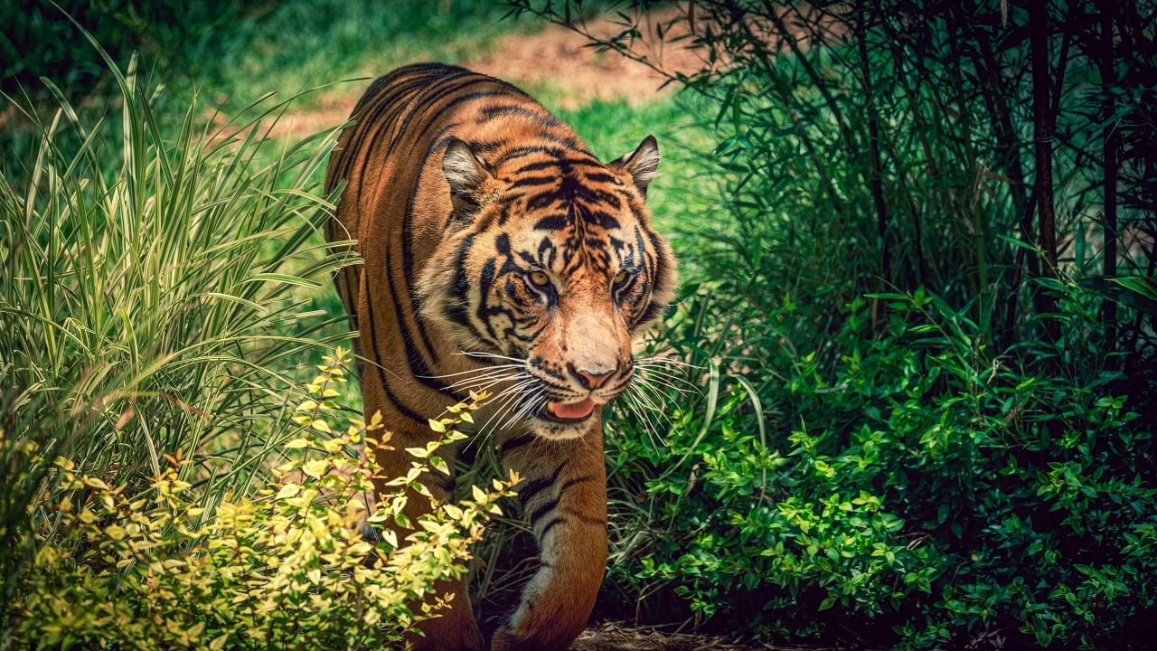 Wallpaper Big beautiful tiger walking on green grass