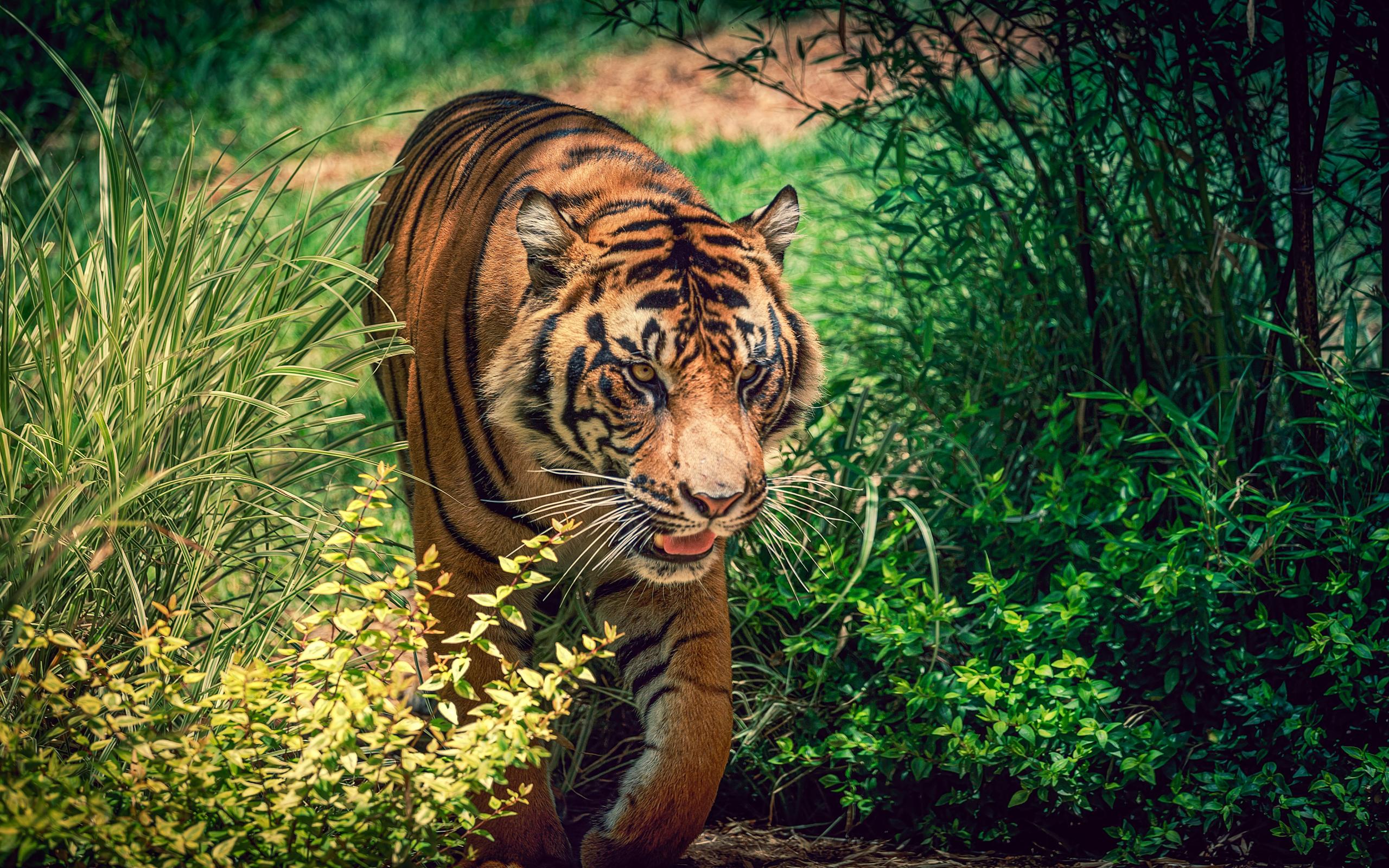 Wallpaper Big beautiful tiger walking on green grass
