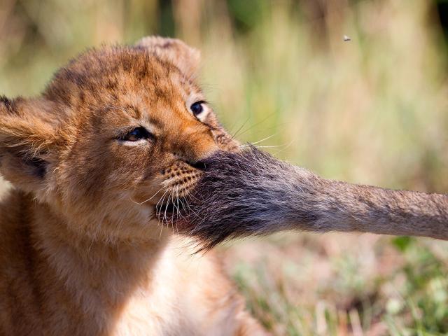 Wallpaper A little lion cub plays with the tail of a lioness