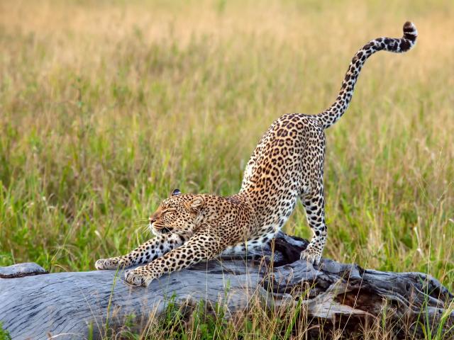 Wallpaper A beautiful leopard is sitting on a dry snag