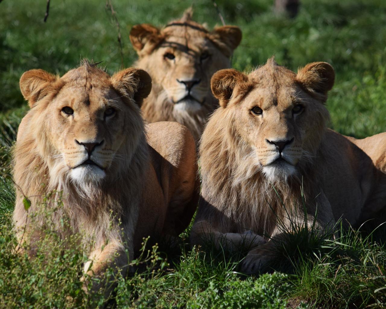 Wallpaper Three lionesses lie on the green grass