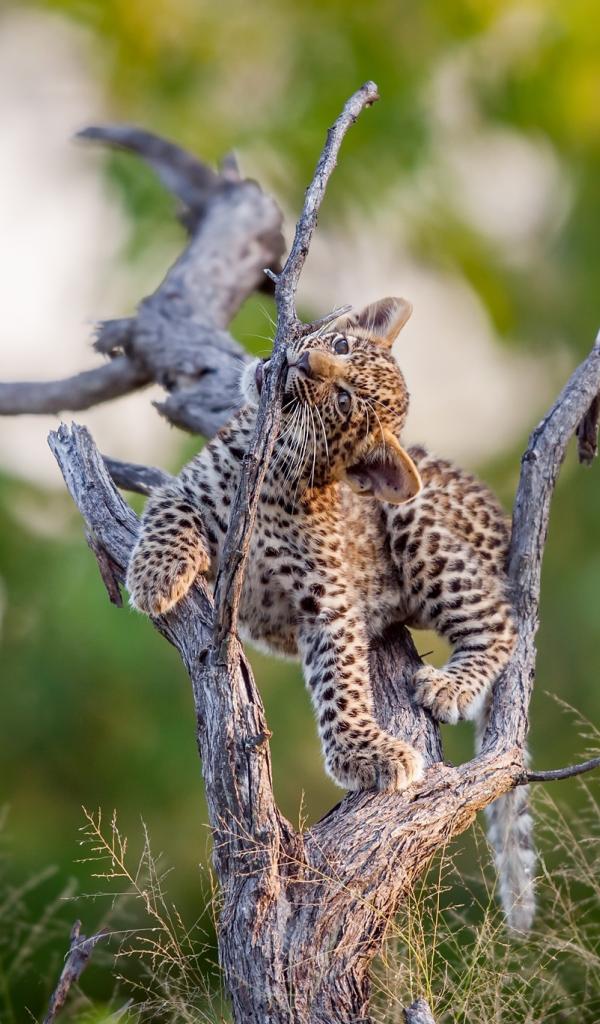Wallpaper A little cute leopard playing on a dry tree
