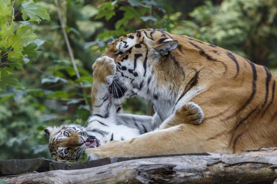 Wallpaper A large tigress plays with a small tiger cub