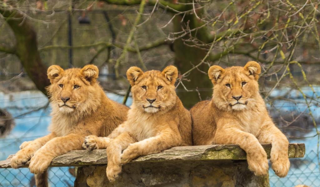 Wallpaper Three graceful lionesses lie on a stone in the zoo
