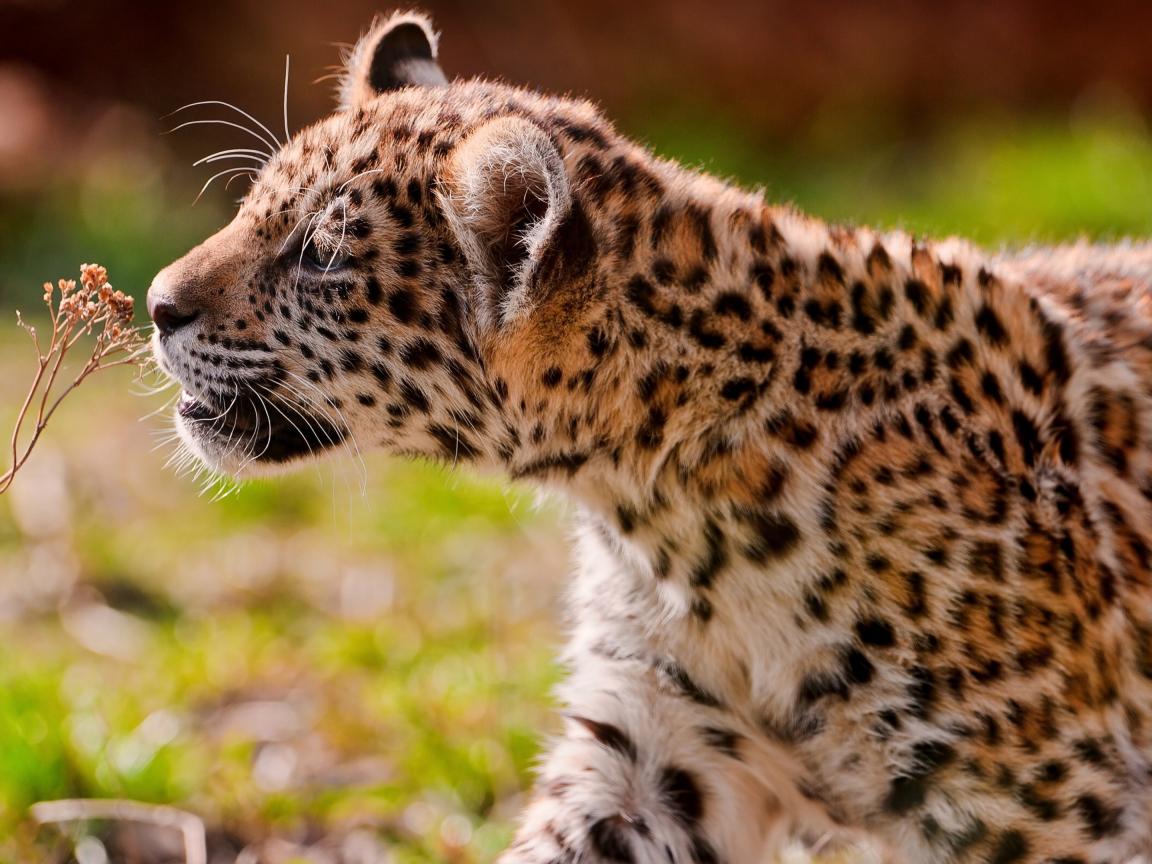 Wallpaper Big spotted jaguar sniffs dry grass