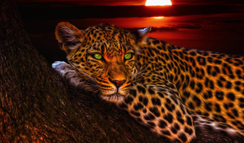 Wallpaper Green-eyed leopard lies on a tree at sunset