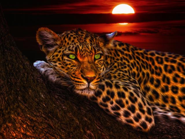 Wallpaper Green-eyed leopard lies on a tree at sunset