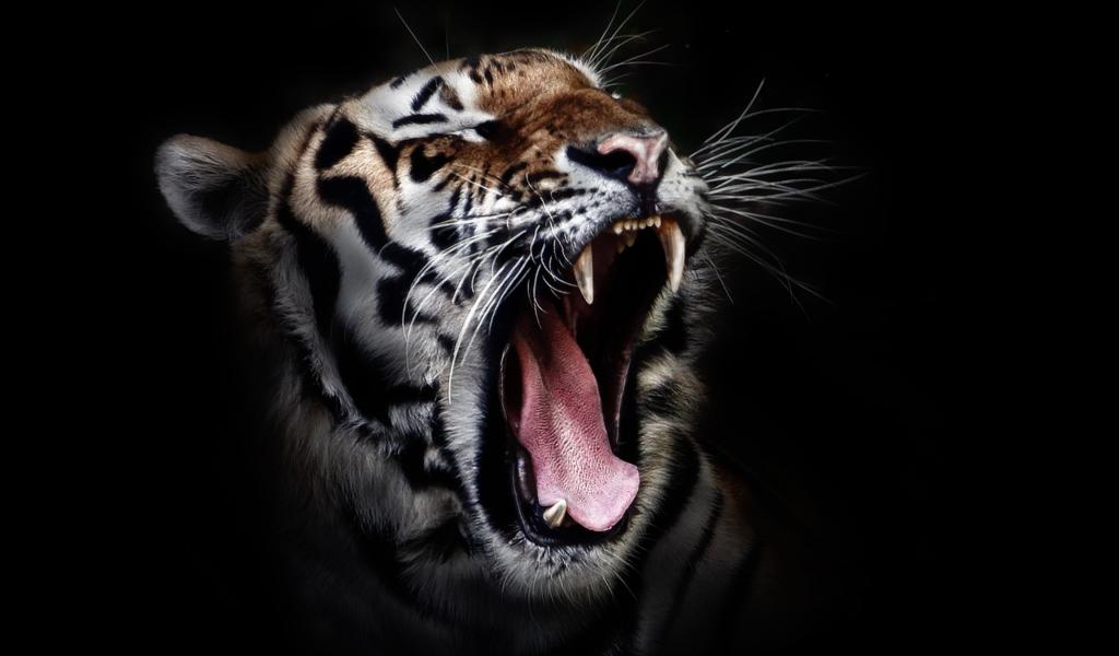 Wallpaper Yawning tiger on a black background