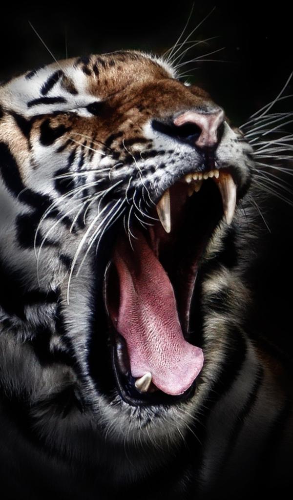 Wallpaper Yawning tiger on a black background
