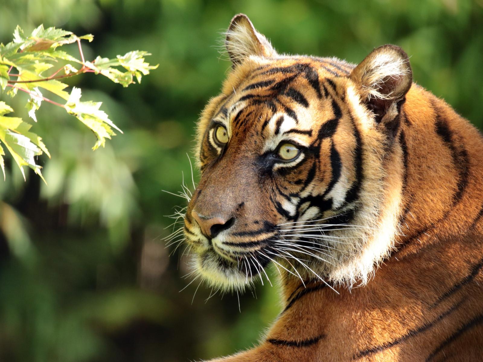 Wallpaper A large striped tiger at the branches of a tree