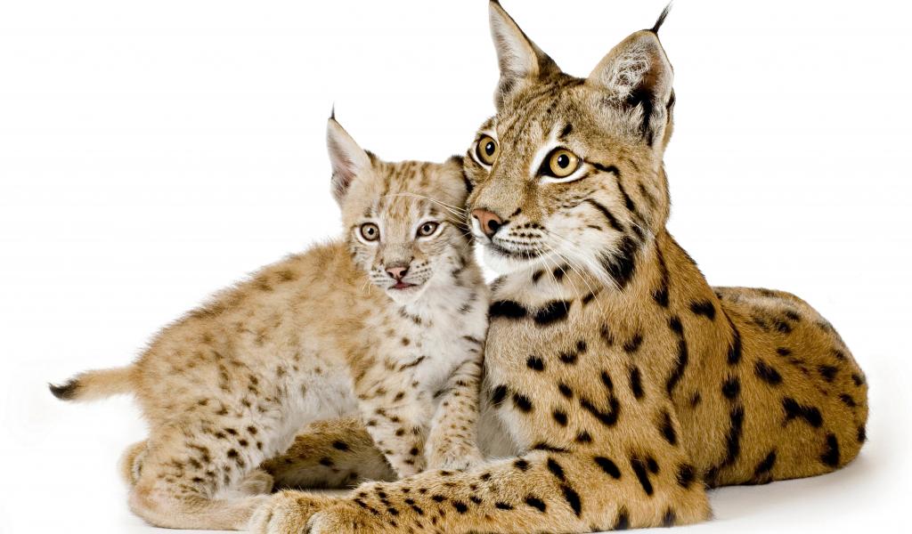 » Wallpaper Big lynx with little cub on white background