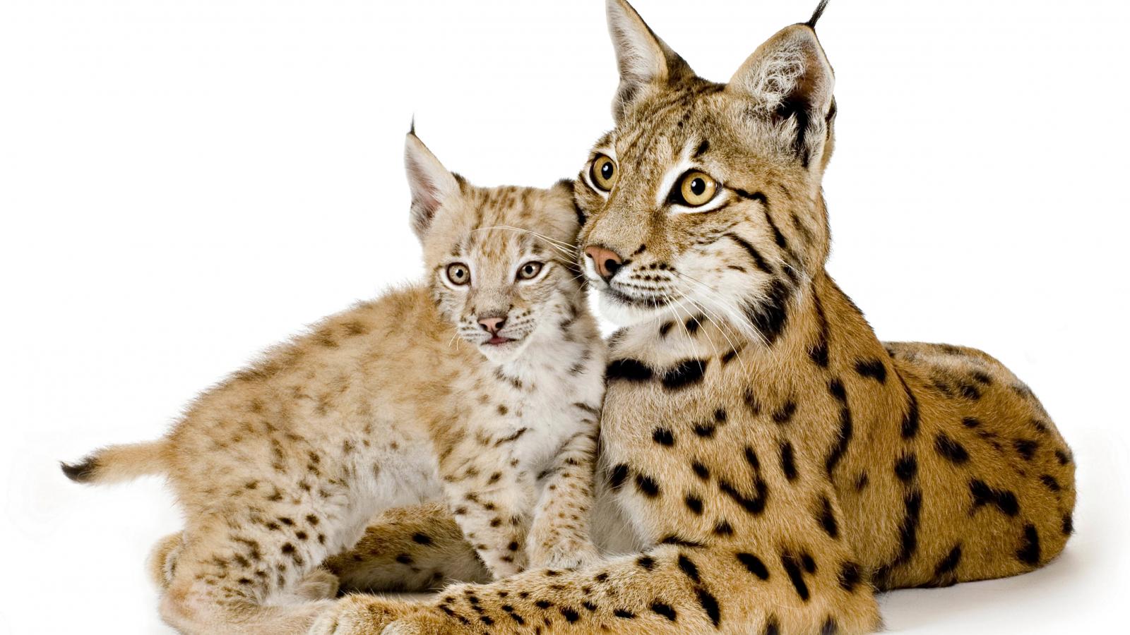 » Wallpaper Big lynx with little cub on white background