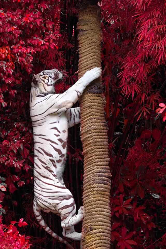 Wallpaper A large white tiger climbs a tree among the red leaves