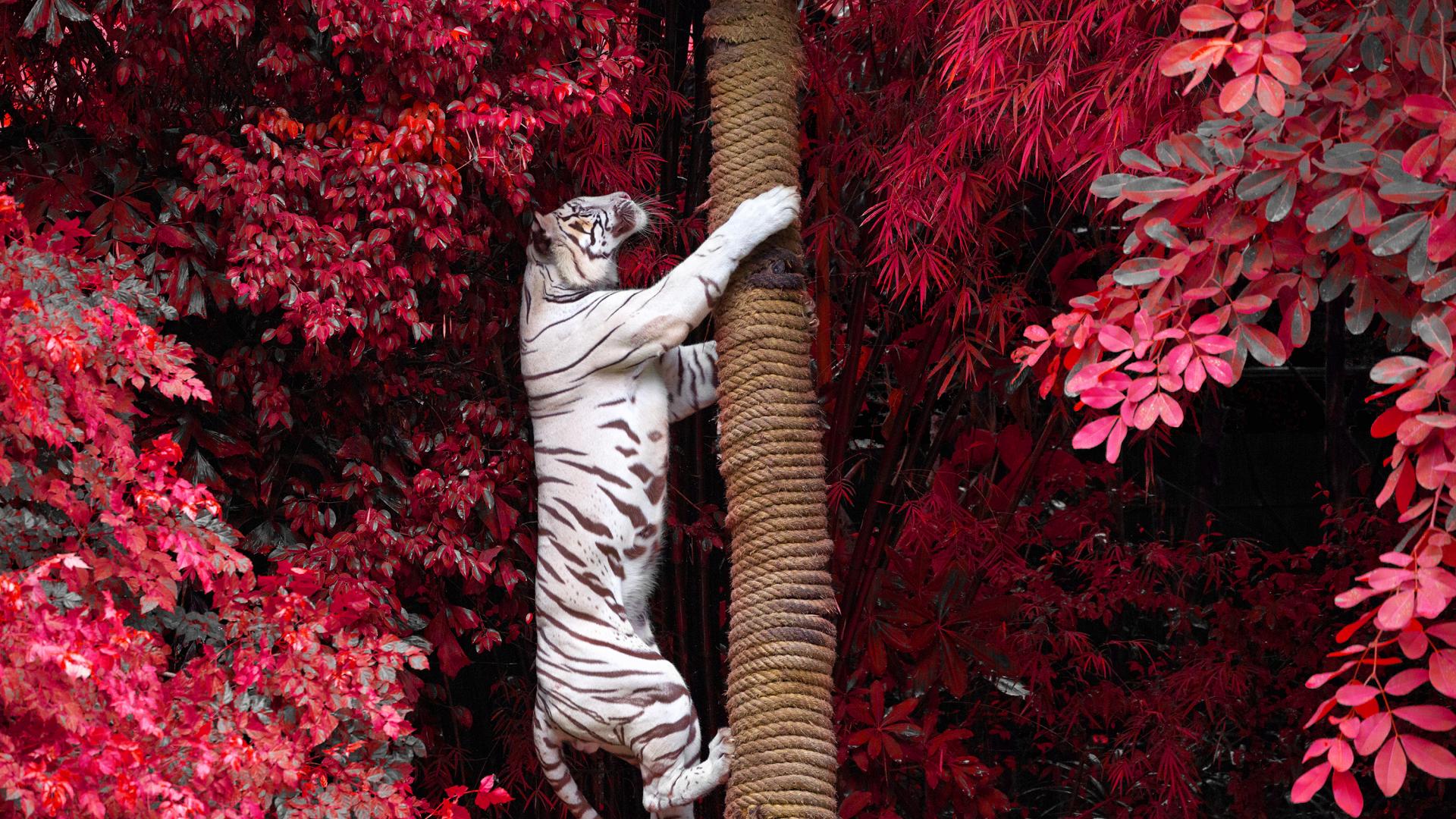 Wallpaper A large white tiger climbs a tree among the red leaves
