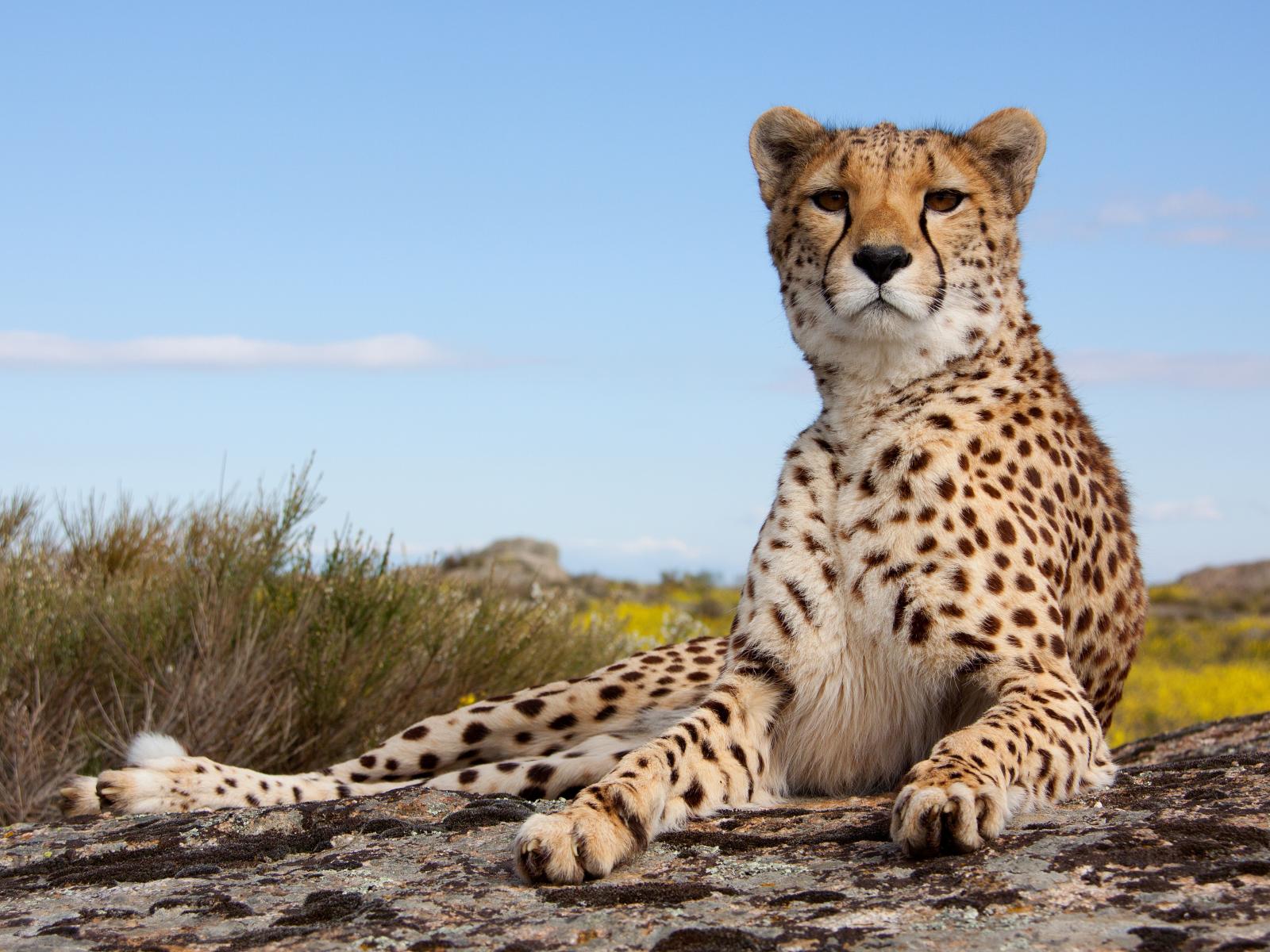 Wallpaper A beautiful leopard lies on a rock under a blue sky