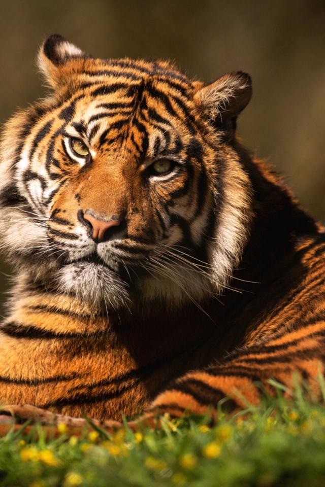 Wallpaper A severe tiger lies on the green grass