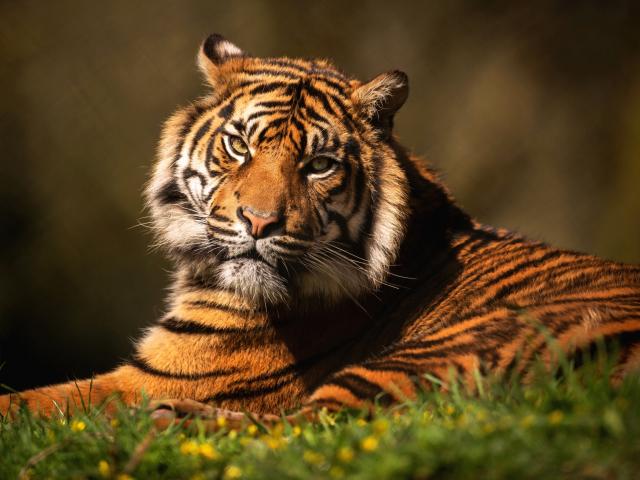 Wallpaper A severe tiger lies on the green grass