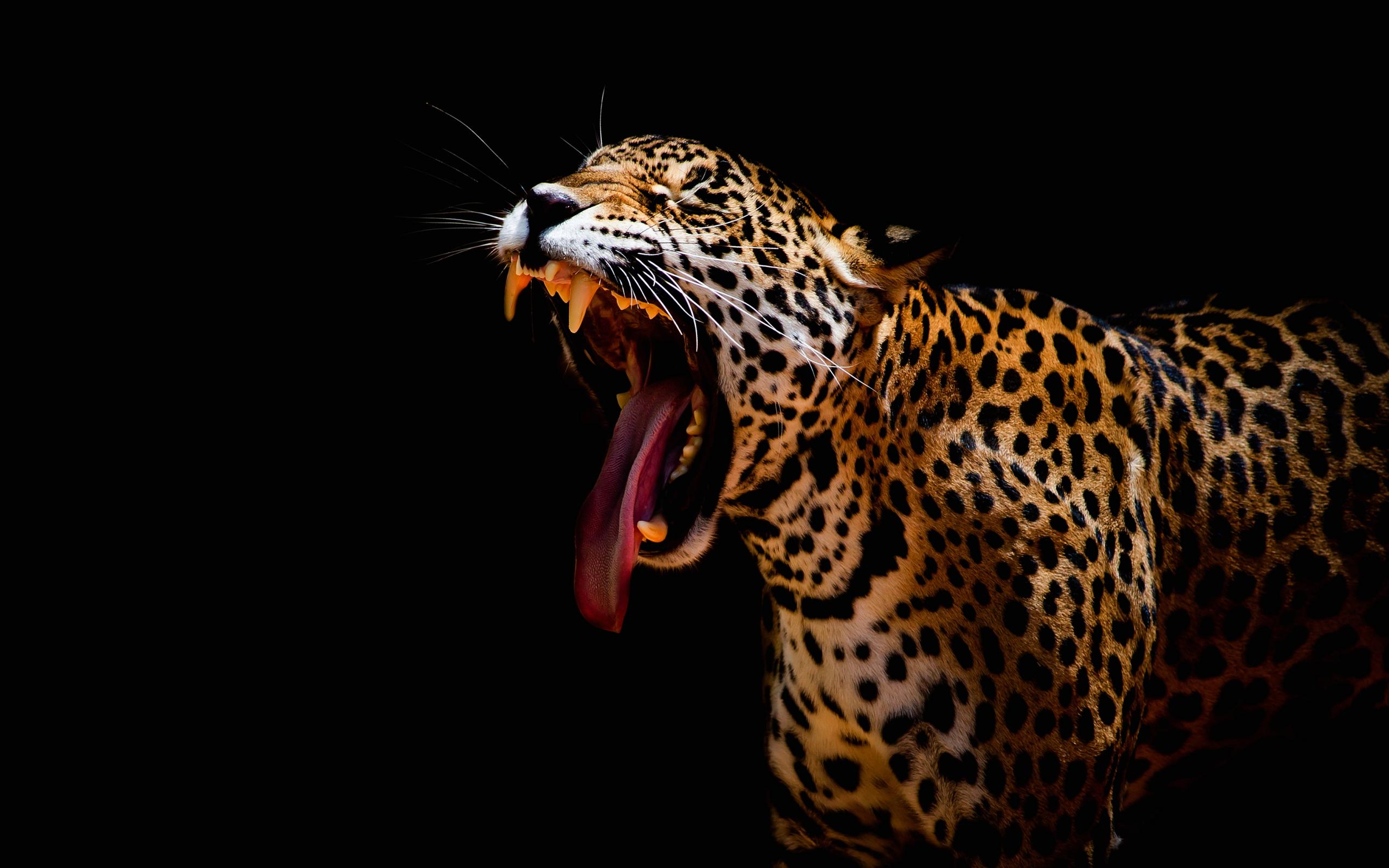 Wallpaper The big leopard yawns on a black background