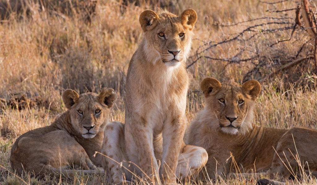 Wallpaper Three lionesses are sitting on the dry grass