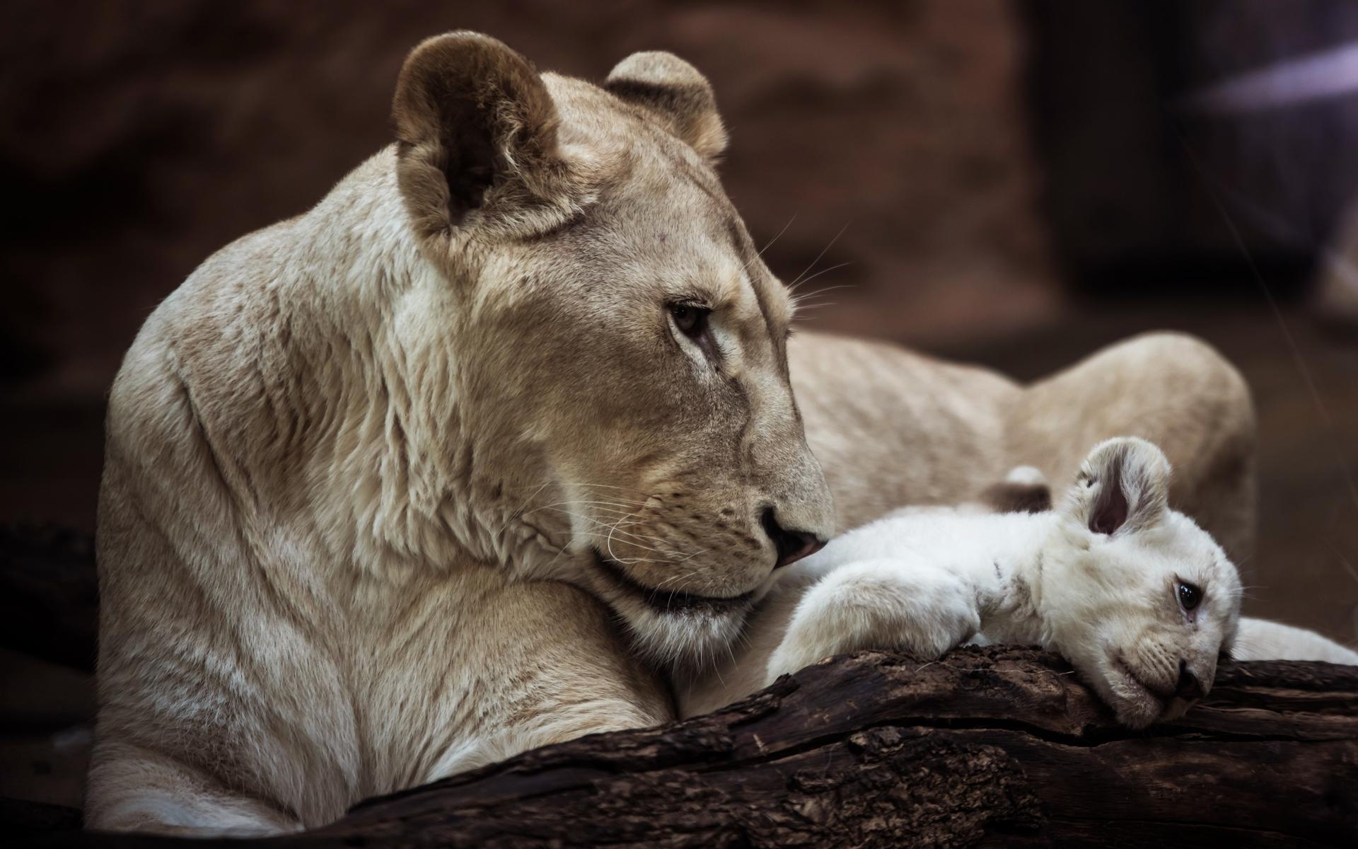 Wallpaper Big lioness with a little lion cub at the zoo