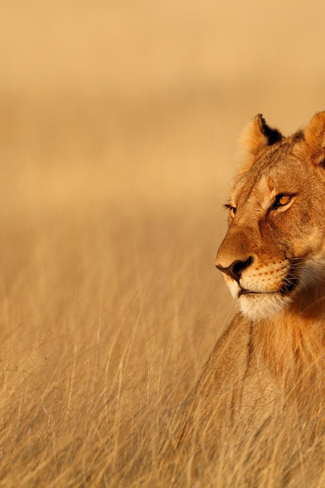 Wallpaper A big lioness sits in the dry grass in the sun