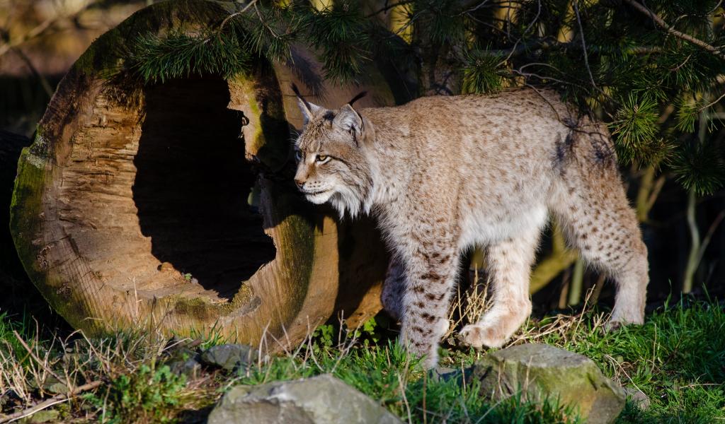 Wallpaper Wild lynx in the woods near the dry wood