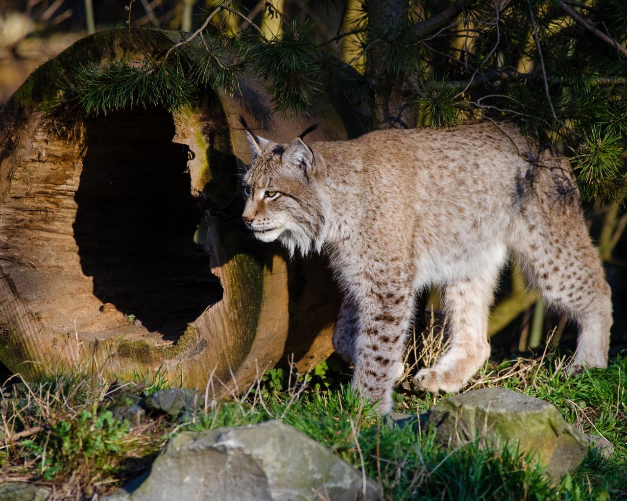 Wallpaper Wild lynx in the woods near the dry wood