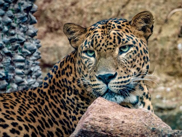 Wallpaper Spotted leopard with green eyes lying near stones