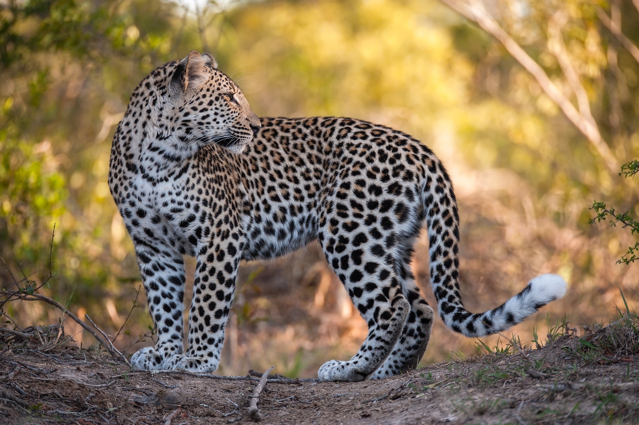 Wallpaper A beautiful spotted leopard stands on the road.