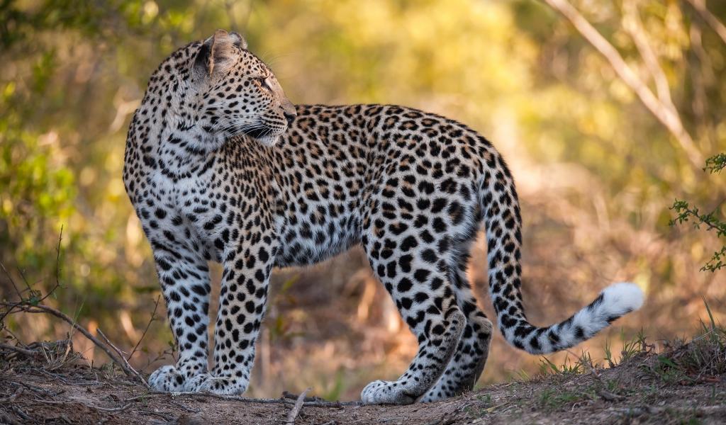 Wallpaper A beautiful spotted leopard stands on the road.