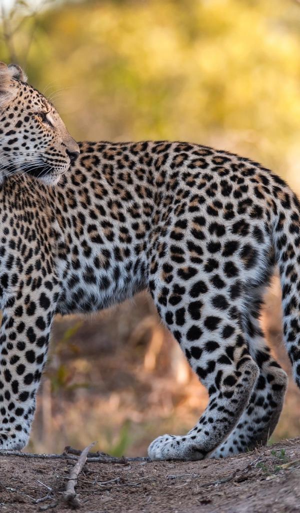 Wallpaper A beautiful spotted leopard stands on the road.
