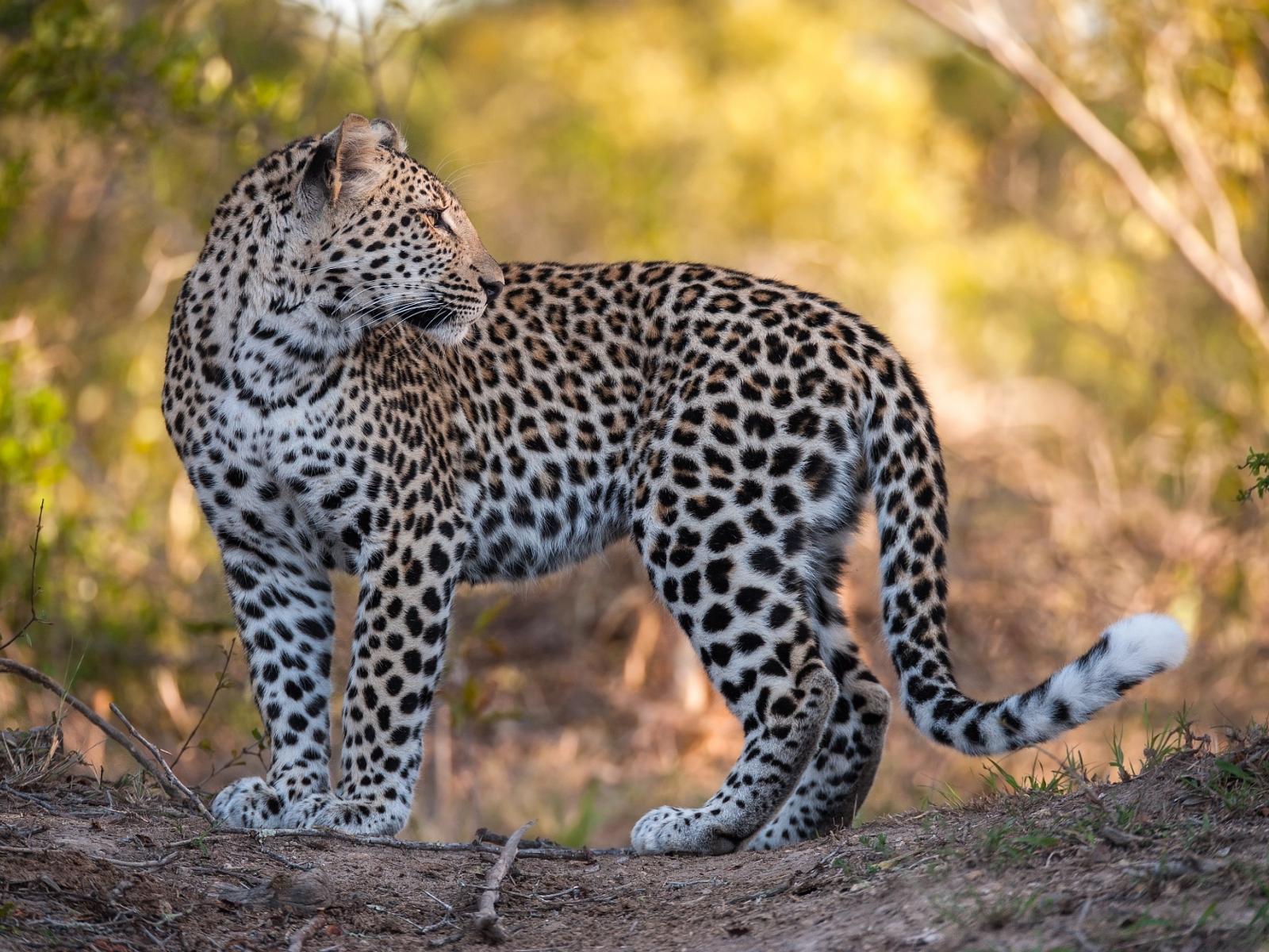 Wallpaper A beautiful spotted leopard stands on the road.