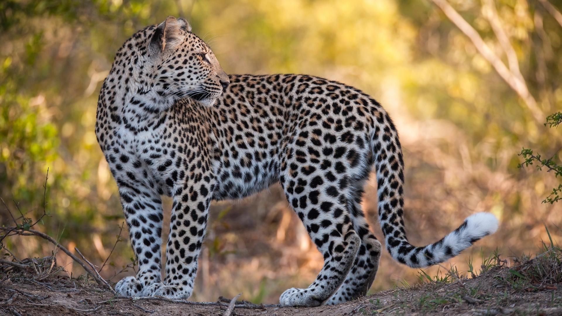 Wallpaper A beautiful spotted leopard stands on the road.