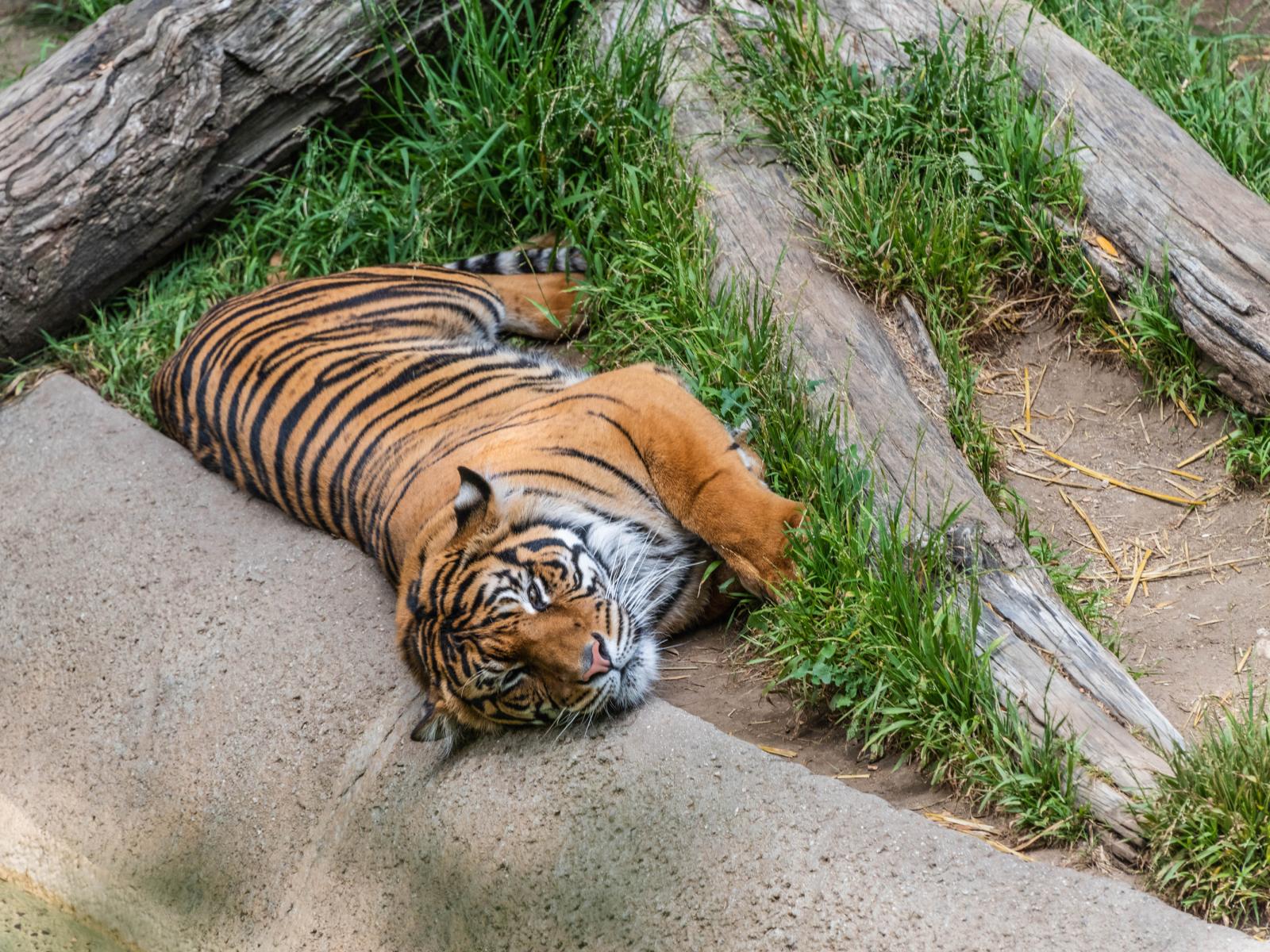 Wallpaper A large striped tiger lies on the green grass at the zoo.