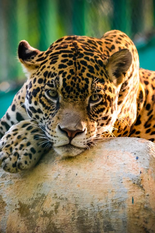 Wallpaper Big spotted jaguar lies on the stones in the zoo