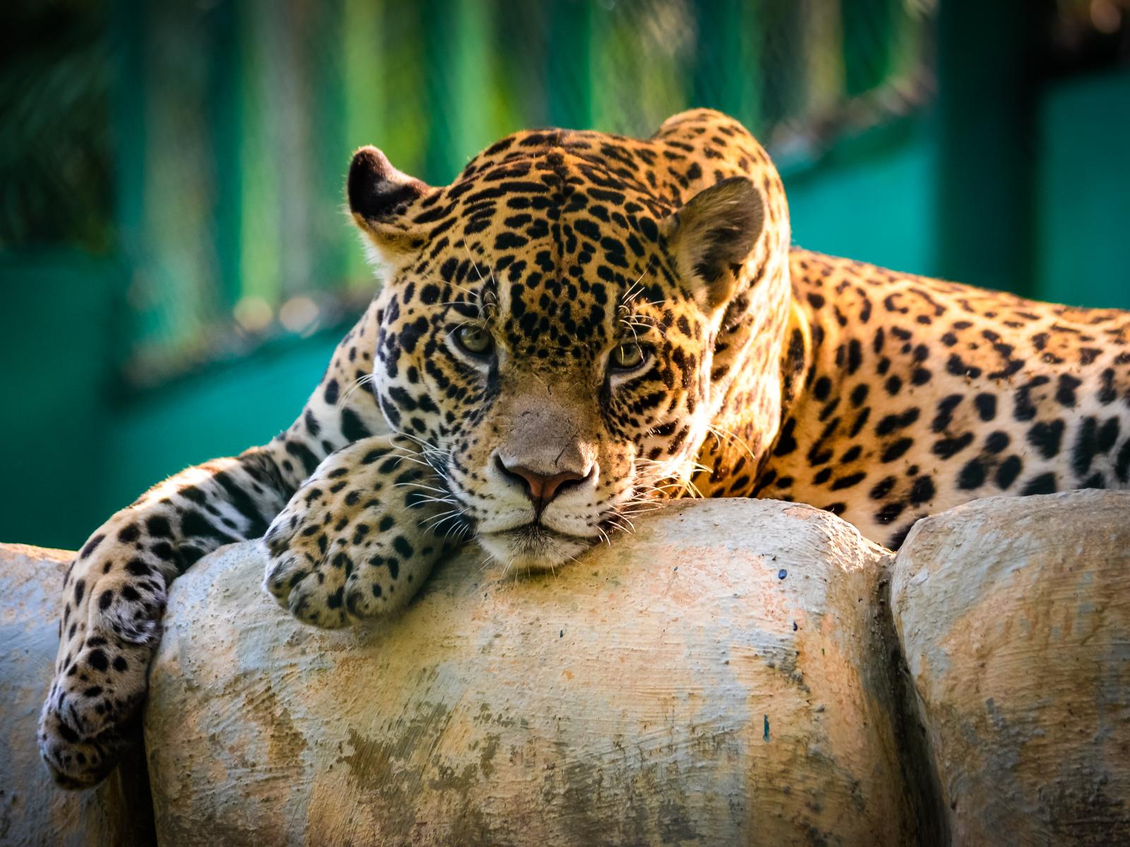 Wallpaper Big spotted jaguar lies on the stones in the zoo