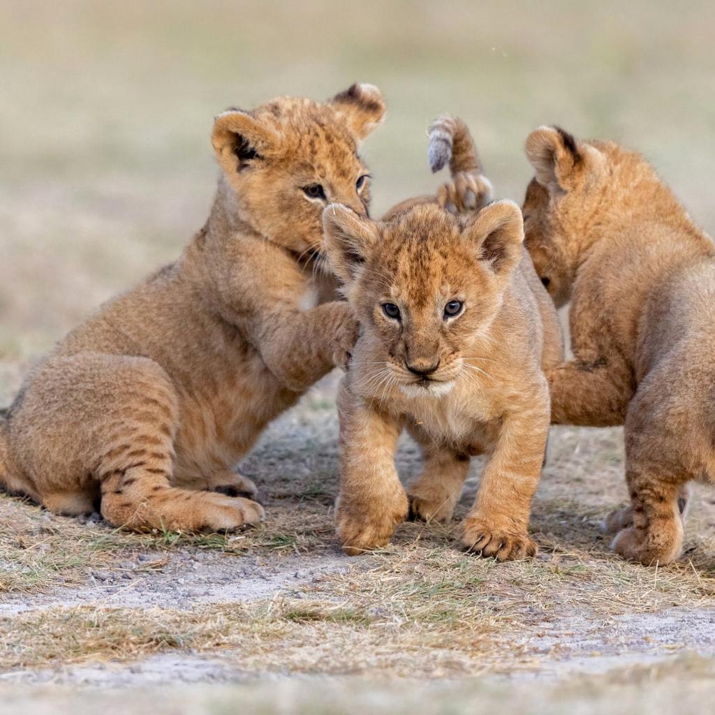Wallpaper Three little lion cubs are playing on the ground.