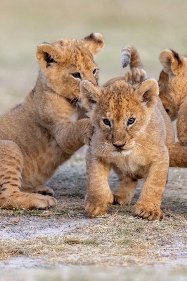 Wallpaper Three little lion cubs are playing on the ground.