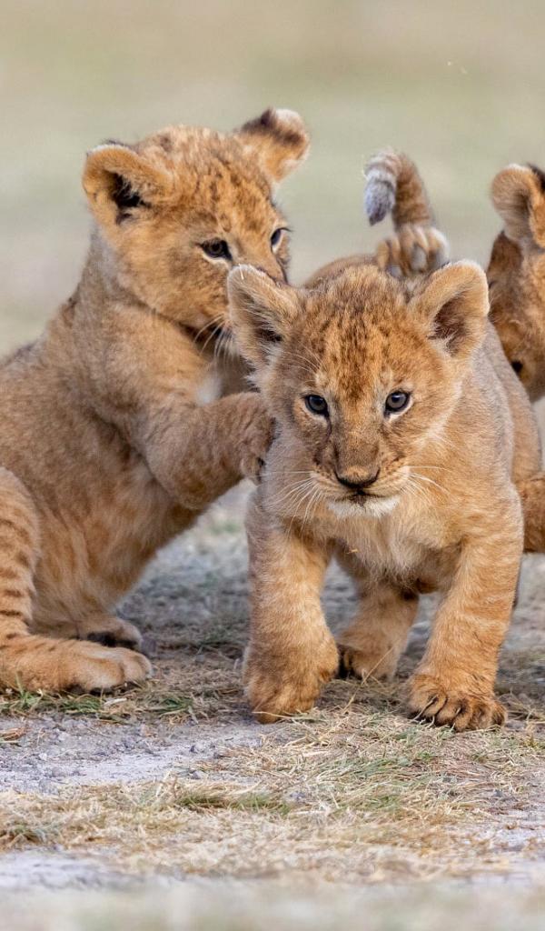 Wallpaper Three little lion cubs are playing on the ground.
