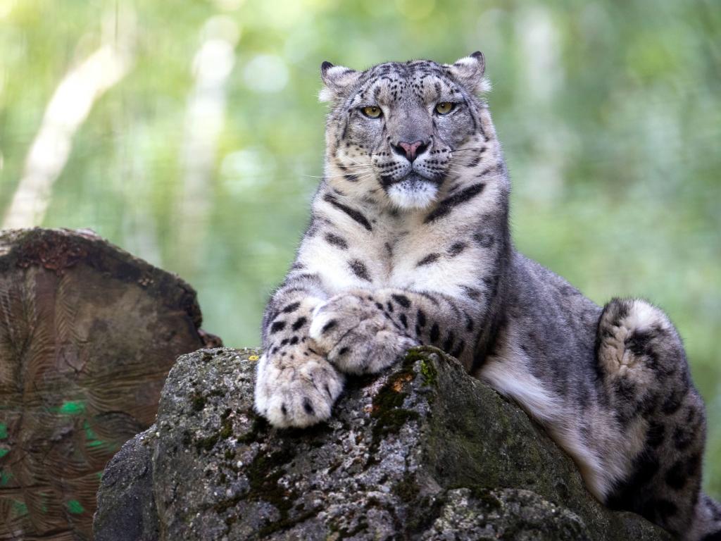Wallpaper Big snow leopard lies on a stone