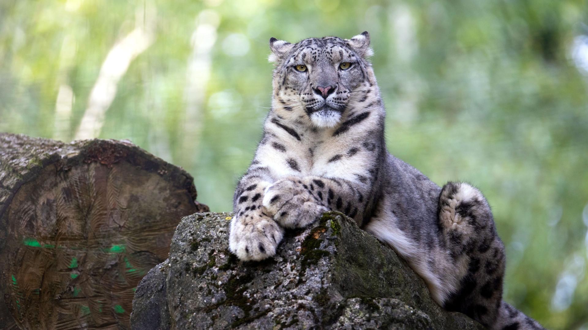 Wallpaper Big snow leopard lies on a stone