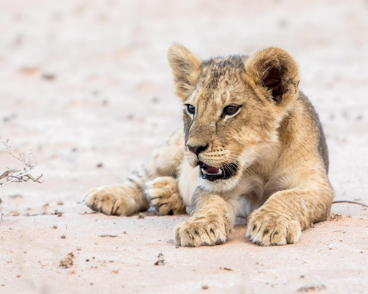 Wallpaper Little funny lion cub lies on the sand
