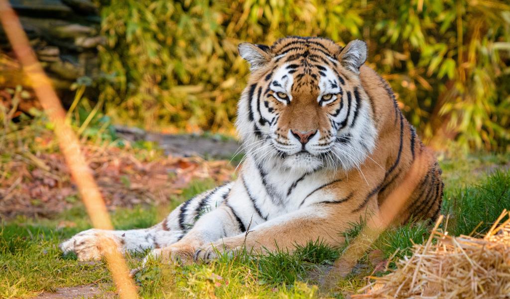 Wallpaper A harsh striped Amur tiger lies on the grass