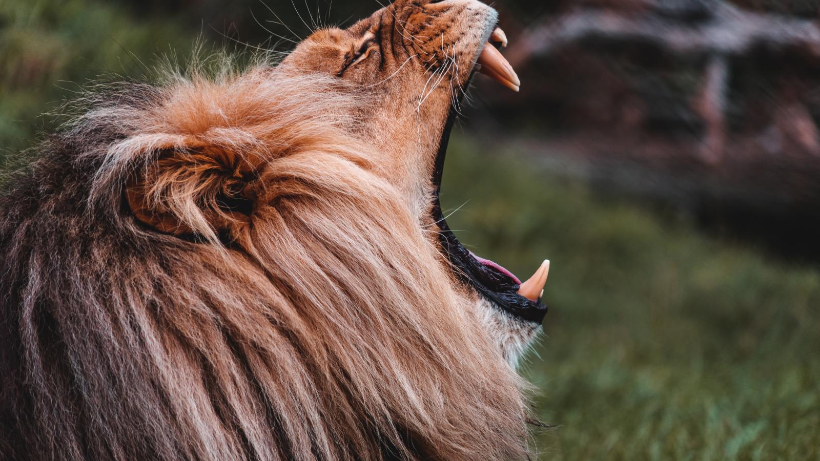 Wallpaper The lion opened its mouth with sharp fangs.