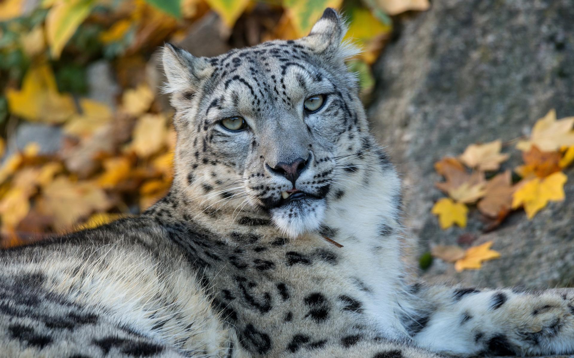 Wallpaper Big spotted snow leopard lies on the ground in autumn