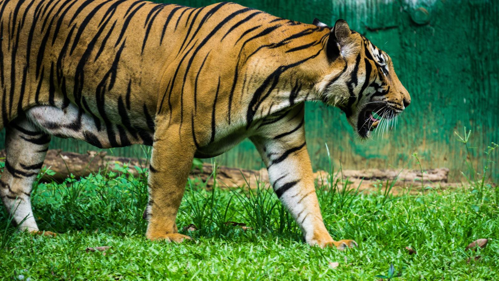 Wallpaper Big striped tiger walks on green grass.