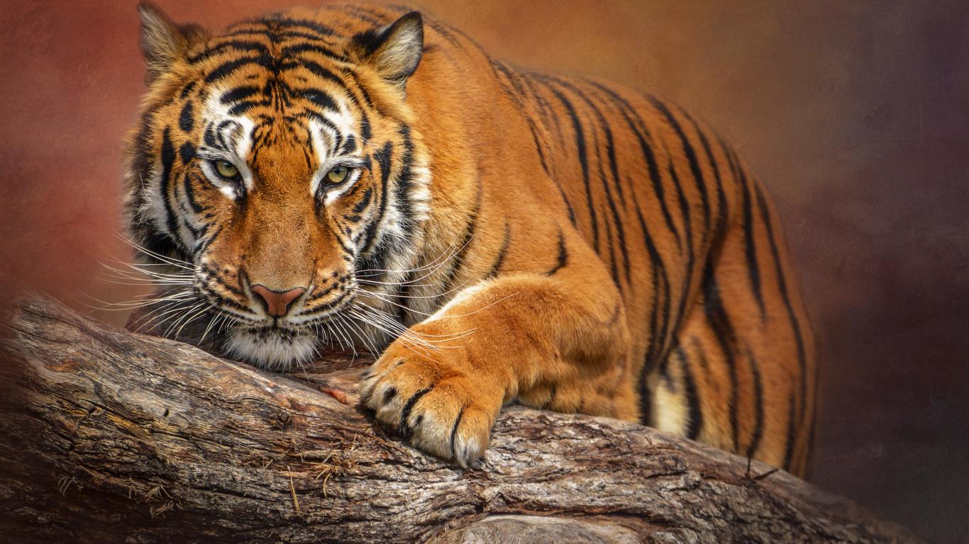 Wallpaper A large striped tiger sits on a dry tree.