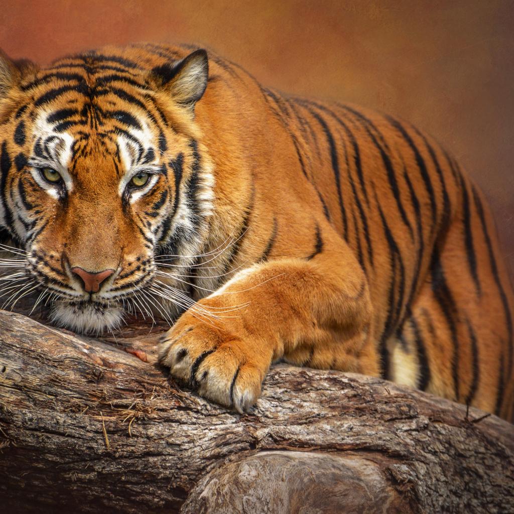 Wallpaper A large striped tiger sits on a dry tree.