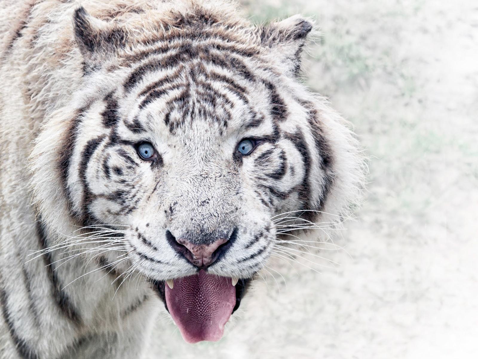 Wallpaper White blue-eyed tiger with a protruding tongue